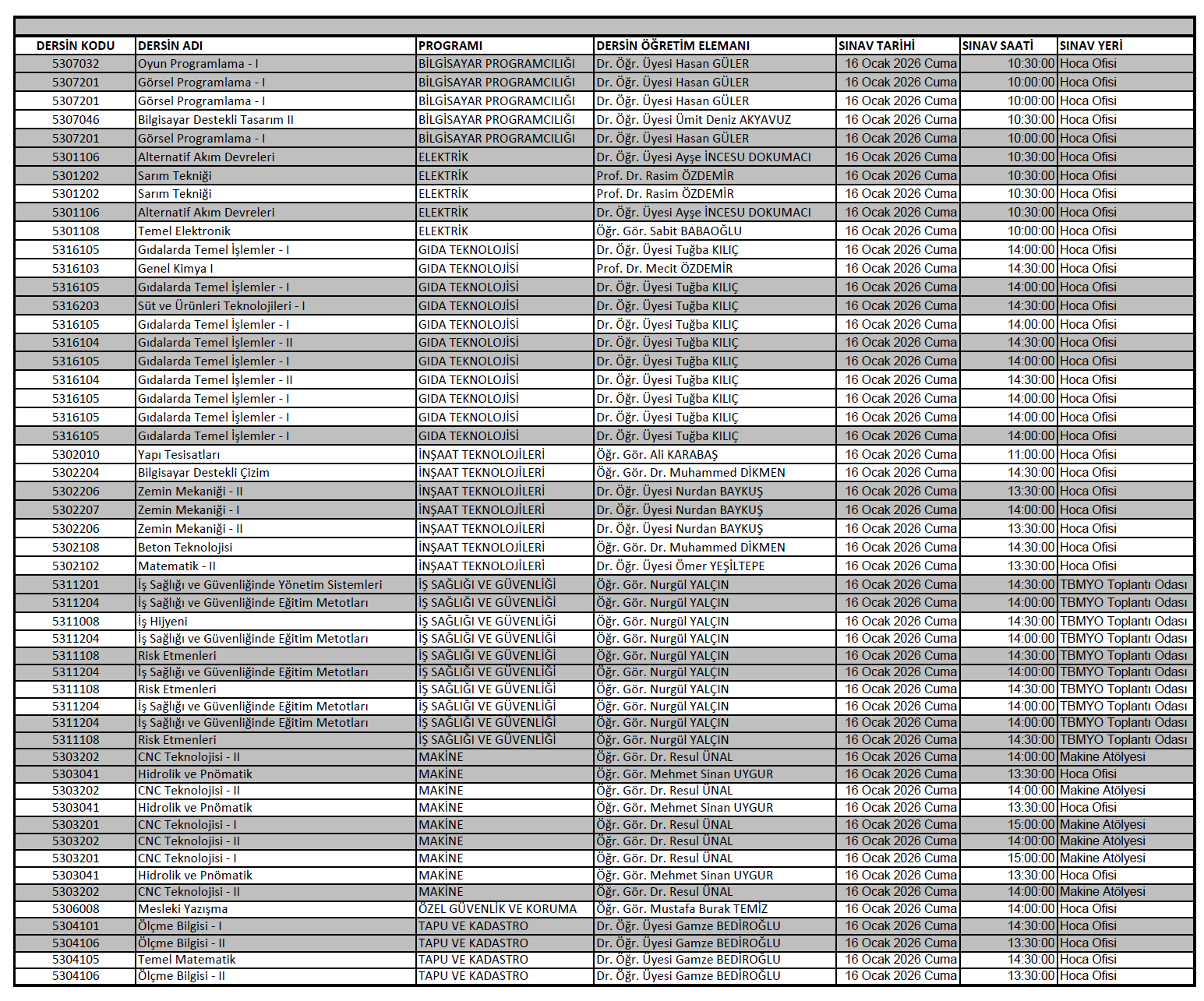 2025-2026 Bahar Ders Programı