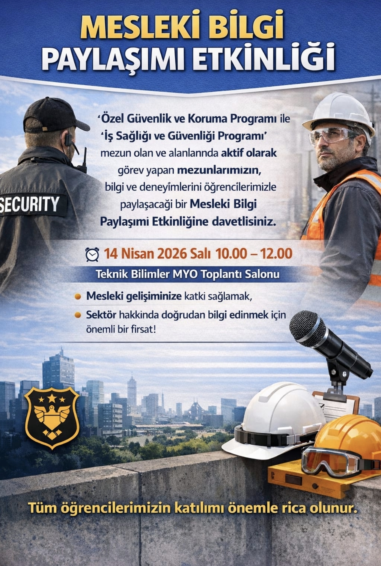 Mülkiyet Koruma ve Güvenlik Bölümüne bağlı Özel Güvenlik ve Koruma Programı ile İş Sağlığı ve Güvenliği Programından mezun olup alanlarında aktif olarak görev yapan mezunlarımızın, bilgi ve deneyimlerini öğrencilerimizle paylaşacağı Mesleki Bilgi Paylaşımı Etkinliği düzenlenecektir.